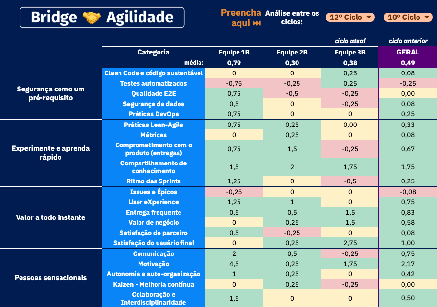 👉 A ferramenta: localizada em uma planilha, para facilitar a gestão do conhecimento e possibilitar a criação de várias abas e visualizações. É nela que constam as instruções, a visualização de todas as perguntas, dados históricos das aplicações anteriores e análise entre ciclos. O intuito é centralizar em um só lugar o histórico das aplicações, possibilitando uma rica análise comparativa ao decorrer do tempo. Assim, a ferramenta é utilizada por todos os níveis da organização, como operacional (equipes ágeis), tático ( supervisores dos projetos) e estratégico (c-levels).