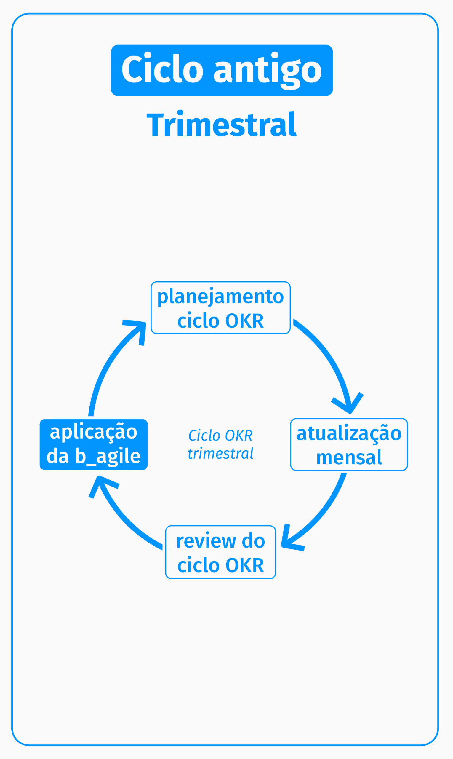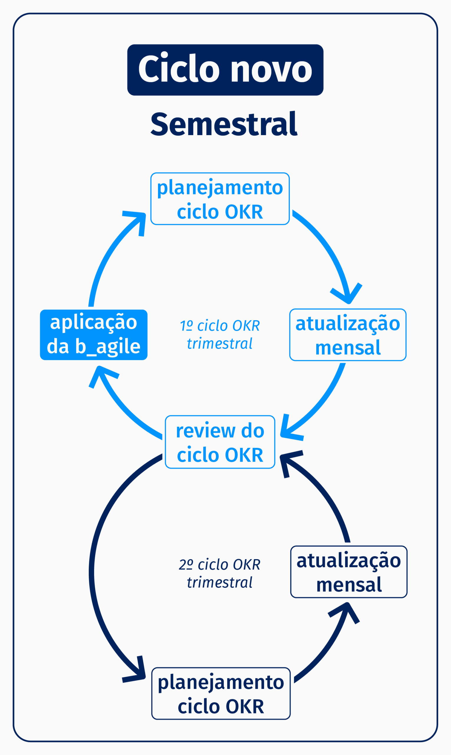 Com isso, atualizamos o processo para a imagem à direita, onde a aplicação passa a ocorrer semestralmente. Optamos pela aplicação semestral, cabendo à equipe manejar o que será alocado para cada um dos dois ciclos OKRs entre uma aplicação e outra.