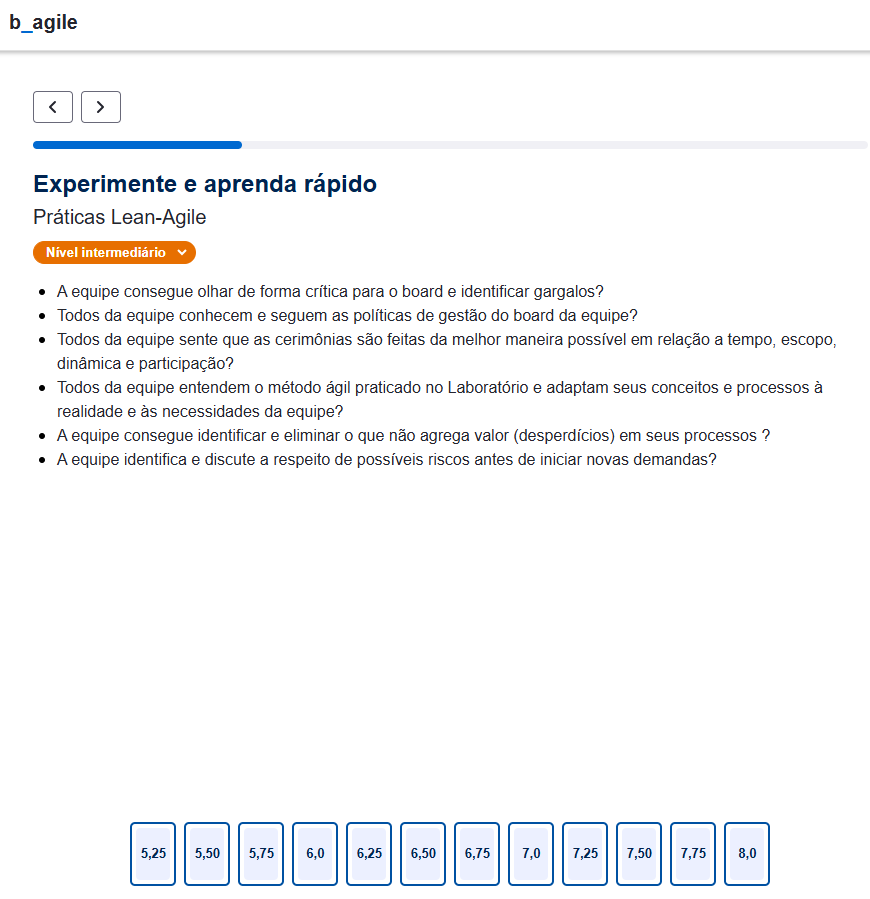 Durante a aplicação, o que a equipe visualiza são as perguntas no nível configurado previamente pelo Scrum Master e o baralho com o intervalo de notas referente ao nível que a categoria está sendo aplicada. Os intervalos de notas são: 1 a 5 no nível básico, 5,25 a 8 no nível intermediário e 8,25 a 10 no nível avançado, sendo que o intervalo entre cada nota é de 0,25.