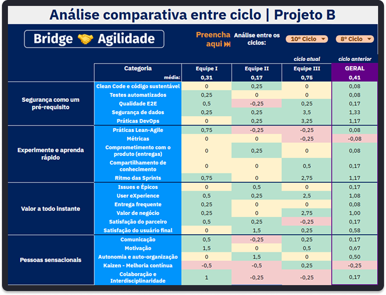 A b_agile ajudou muito a identificar e atacar os pontos de melhoria dentro do time, possibilitando traçar objetivos em conjunto e trabalhar nos desafios de uma equipe ágil em constante evolução de forma direta. Além disso, após 20 aplicações, conseguimos ver claramente a evolução do time junto com a ferramenta.