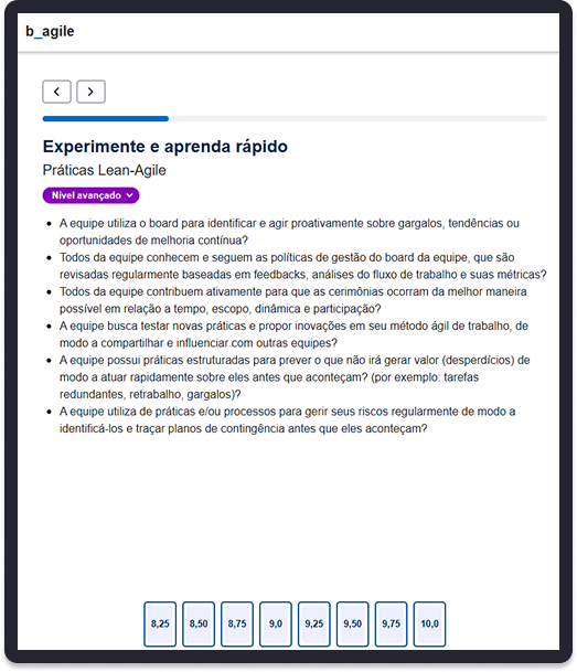 A b_agile é nossa ferramenta própria para mensuração da maturidade ágil dentro das equipes de desenvolvimento. Inspirado nas melhores práticas do mercado, nossa metodologia é adaptada à nossa realidade para garantir um espaço flexível para diferentes contextos internos, e que incentiva a autonomia das equipes.